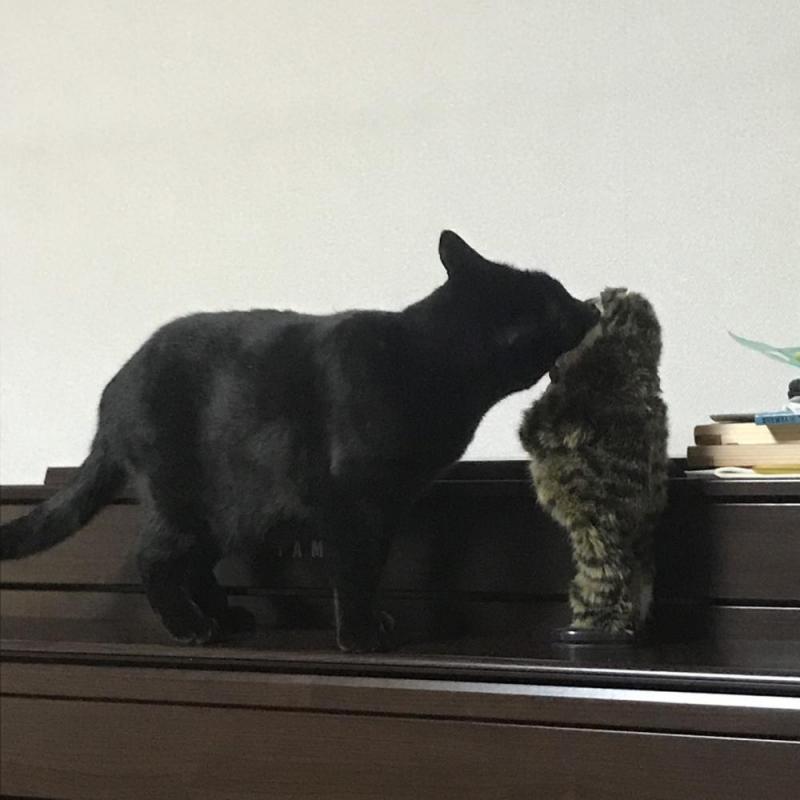 猫のおもちゃに挨拶?顔をくっつけています。by りゅ