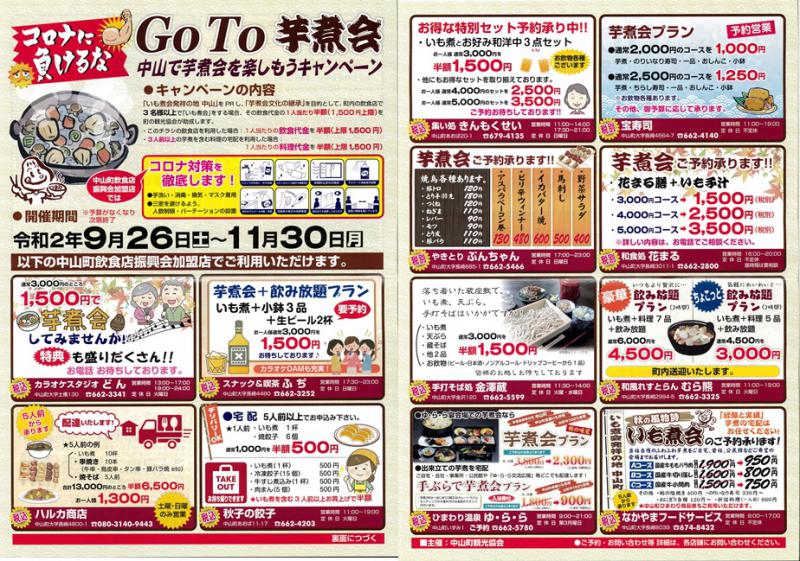 「いも煮会発祥の地 中山」をPRし、「芋煮会文化の継承」を目的として、町内の飲食店で3名様以上で「いも煮会」をする場合、その飲食代金の一人当たり半額(1500円上限)を町の観光協会が助成します。