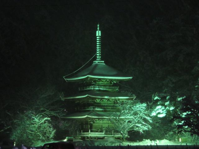 昨日一日中降り続いた雪で雪化粧した三重塔は、