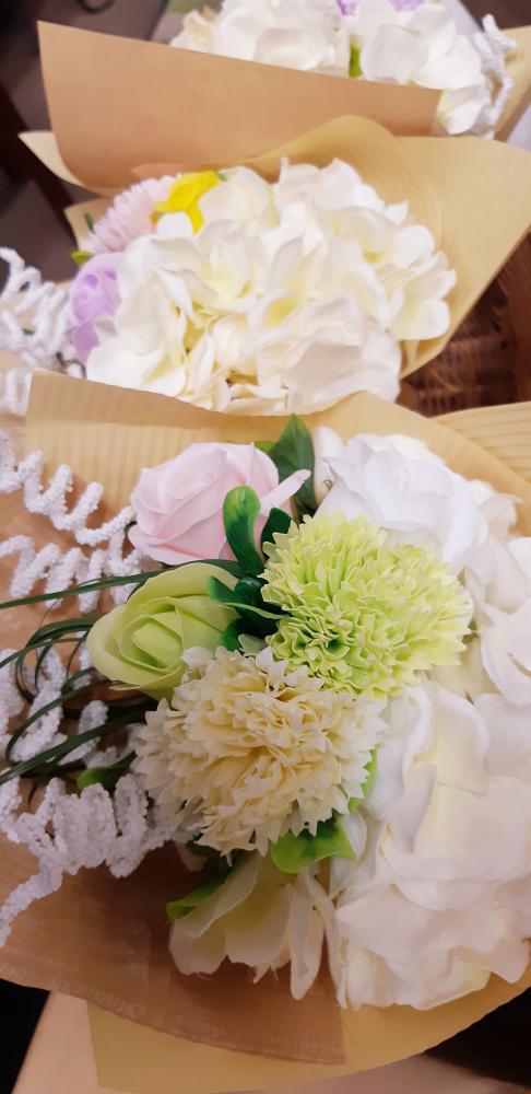 優しい色合いのブーケちょっとづつ違いますラッピングのまま置いても飾れるブーケ