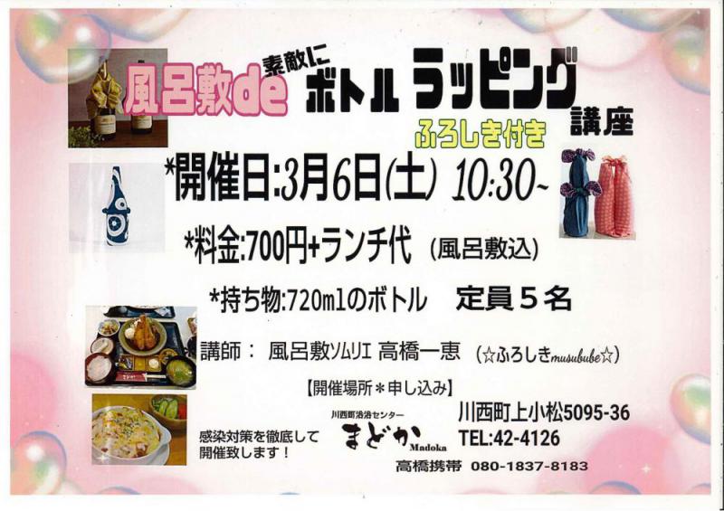 風呂敷で素敵にボトルラッピング講座開催(ふろしき付)開催日:3月6日(土) 10:30〜場 所:まどか会議室料 金:700円(風呂敷込)+ランチ代定 員:5名持ち物:720mlのボトル講 師:風呂敷ソムリエ 高橋一恵申込みは 川西町浴浴センターまどか TEL0238-42-4126     風呂敷ソムリエ高橋一恵携帯 080-1837-8183※感染症対策徹底して、開催いたします!!