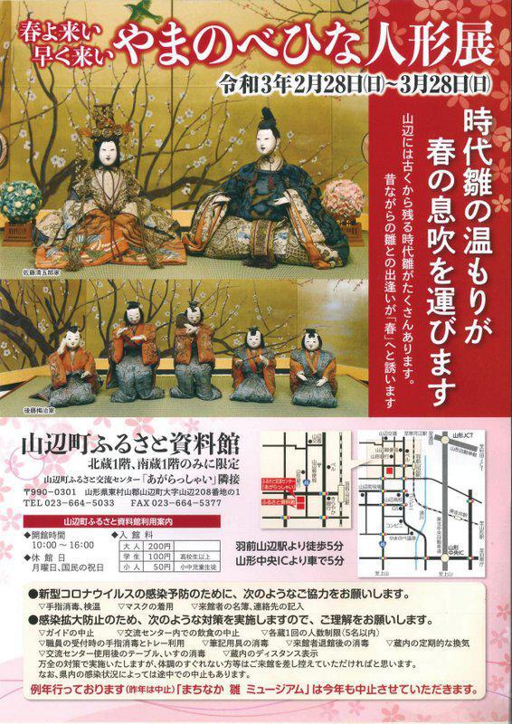 ふるさと資料館では、2月28日(日)から、「やまのべひな人形展」を開催します。山辺町には、江戸時代より最上川舟運や紅花交易で取り寄せたとされる貴重な時代雛がたくさん残されています。寛永から明治の時代雛をそれぞれ作られた時代の飾り方で、小道具一つ一つにもこだわりながら展示しています。作られた時代で違った特徴をもつ時代雛をゆっくりご覧ください。なお、まちなか雛ミュージアムは中止させていただきます。 「やまのべひな人形展」日 時:令和3年2月28日(日)〜3月28日(日)   (月曜日・祝日は休館日)場 所:ふるさと資料館時 間:10:00〜16:00入館料:大人200円、学生(高校生以上)100円、小人(小中児童生徒)50円お問い合わせ先:ふるさと資料館        TEL023−664−5033※新型コロナウイルス感染状況によっては開催途中で中止の場合があります。※新型コロナウイルス感染予防のため、手指消毒・検温、マスクの着用、来館者の名簿への記入をお願いします。※体調のすぐれない方はご来館をご遠慮ください。