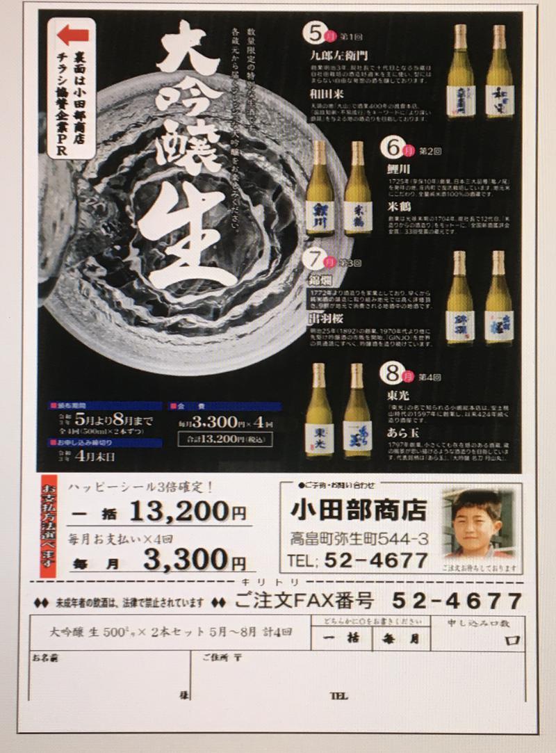 ●はい!小田部商店です!チラシ変更のお知らせ。酒の頒布会!500ミリ 2本