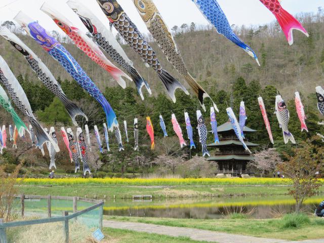 こいのぼり、菜の花、三重塔のコラボレーションが見られるのは、