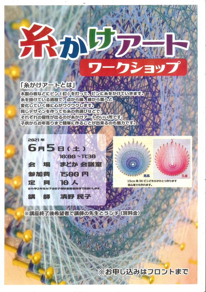 糸かけアートワークショップ「糸かけアートとは」木製の板などにピン(クギ)を打って、ピンに糸をかけていきます。糸をかけている過程で、点から線、線から面へと変化していく様に心がワクワクします。同じデザインを作っても糸の色選びなどで、それぞれの個性が出るのが糸かけアートのいいところです。子供からお年寄りまで簡単に 作ることが出来るのも魅力です。20216月5日(土) 10:00〜11:30会 場:まどか会議室参加費:1,500円込定 員:10名※小学2年生以下のお子様は保護者同伴でお願い致します。講 師:清野 民子