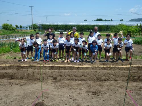 今日3年生21名が、岡の台ごんぼの種まきをしました。地域の先生は、岡の台ごんぼ生産者の小松勝美さん。今年もお世話になります!まず最初に、小松さんから、岡の台ごんぼのことや種まきの仕方、育て方などについてお話をお聞きしました。ユーモアを交えながら説明してくださる小松さんの話に、子供たちも職員も引き込まれ、にこにこ笑顔が絶えませんでした。そして質問タイム!全員が手をあげ質問する中、小松さんは、「手をあげて発表すること、そのことがすごいことなんだぞ!」と、一人一人の質問に丁寧に答えてくださいました。さあ、いよいよ種まきです。小松さんが機械を使って畝を作ってくださいました。あっという間に、とっても綺麗な畝が完成し、大歓声でした。業務技術員の小口先生に手伝っていただきました。ありがとうございます。突然ですが、問題です!これはなんだかわかりますか?実は、色の付いているところがコーティングされたごんぼの種なんです。これまたびっくりでした。こんなふうに紐のような物に種がついていて、畑の端から端にまっすぐに紐を張り、畝の上に置きます。そして、紐が隠れるようにやさしく土をかぶせます。これで種まきも終わりかと思ったら・・・なにやら小松さんが見慣れない機械を準備していました。「おもしゃい機械見せっからまってでな・・・。」子供たちはどきどきわくわくです・・・。なんと、自動種まき機だったのです。あっという間に、種をまき、土をかぶせていきました。文明の利器って素晴らしいですね。これで終わり・・・かと思っていると、小松さんが今度は何かをまいています。これは籾殻でした。籾殻をまくことで、雑草が生えにくくなる、土の水分が保たれるなどのよいことがあるのだそうです。いろいろ学ぶことができました。もっともっとごんぼのことを知りたい子供たちは、種まきが終わってからも意欲的にインタビューしていました。地域にある宝物をこれまで以上に身近に感じ、ふるさとに誇りを持った時間になりました。子供たちの質問に、「ごんぼにはどれくらい水をかけるのか」という質問がありました。小松さんの答えは、「かけません。」でした。びっくりした子供たち!小松さんは、「水かけは自然に任せています。ごんぼに苦労させるんです。」とおっしゃっていました。そういえば、「可愛い子には旅をさせよ」ということわざもあります。どこか教育そして子育てに通ずるものがあるように感じました。「がってしない逞しい子供」に育ってほしい!そう願っています・・・