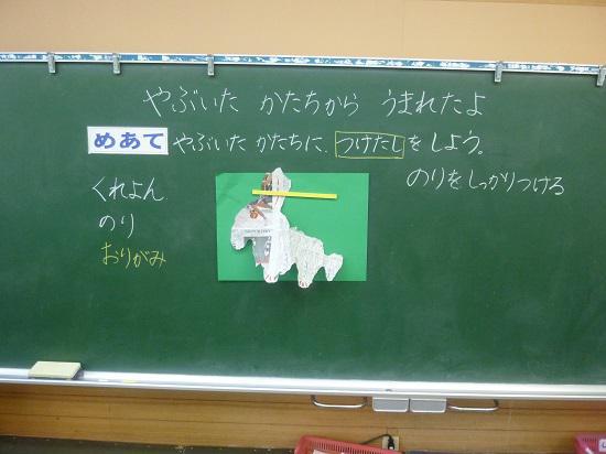 1年生の教室に行ってみると、おもしろい勉強をしていました。紙をやぶいて、そこから想像できるものを台紙に貼って、作品を作るというものでした。とってもかわいいねことうさぎの作品です。これはなんだかわかりますか?たずねてみると、「タツノオトシゴ!」と教えてくれました。上手にできていますね。これも一つ一つよく見てみると、「なるほど!」です。わかりますか?いろんな果物がありますね。しかも、新聞紙の形だけでなく、写真も活用しています!(さくらんぼ)この子は、図鑑を見ながら色を塗っていました。やぶいた新聞紙が車に見えたんですね。新聞紙が台紙からはみ出しています。とってもダイナミックな作品ですね!あるお友達が言っていました。「(何かの形にしようと)考えながらやぶるのはつまんない!やぶった後に何に見えるか考えるんだ!」子供の発想って、本当に無限に広がっているんですね!校長ぶらぶら・・・・図書室に来てみました。5年生も図工のお勉強でした。ペンチを使って針金を曲げていました。作品作りがまだ始まったばかりのようです。中には初めてペンチを使う子もいました。「手が痛い・・・」苦労した分だけ、最高の作品になりますよ・・・。がんばって!ここは4年生の教室。なにやら机の上に植物が・・・。これは昨年度の6年生から受け継いだカラマツ。一人一鉢(人数により2つ担当している子もいます。)の苗木を大事に育てています。今日は定規を使って、生育状況を調べていました。「大きくなってるかな・・・」大事に育てられたカラマツは、8月に予定しています「おきたま森の感謝祭」で、植樹する予定です。5,6年生も頑張って取り組んでいます。養護教諭の美友先生は、1年生にブラッシング指導中です。やさしく、ゆっくりと話してくれるので、1年生も一生懸命に取り組んでいました。真剣なまなざしで、美友先生を見ながら、ブラッシングをする1年生。磨く場所に合わせて、歯ブラシを裏返したり、縦にしたり・・・。是非おうちでも声がけしながら、お子さんのブラッシング見てあげてくださいね。あっ!すみません・・・。私がちょろちょろカメラを構えるので、熱心にやっていたお友達の気を散らしてしまいました。気をつけます・・・。美友先生は今年初めて養護教諭となり赴任しました。しかし、新規採用とは思えない仕事ぶりで、子供たちも大好き!私たち職員も頼りにしている先生です。しかも、アイディアマン!保健室前の廊下には、このような掲示物を作ってくださいました。これは自分に自信が持てるようになる「リフレーミング」と言われるものです。青いハートには自分の短所や気になるところが書いてあります。その青いハートをめくると赤いハートに代わります。これまで自分がいやだなと思っていたことが、長所に代わるのです。一人一人の個性を認め合えるような子供を育てていきたいという、美友先生の願いです。例えば「計画性がない」。これを長所とみると・・・?ぜひお子さんに聞いてみてください。最後に6年生の教室へ。明日からいよいよ修学旅行です。最後の話し合い活動でした。どんなことを決めたんだろう・・・。最後は、しっかりと担任の先生のお話をお聞きしました。とっても楽しみです!明日晴れますように・・・!