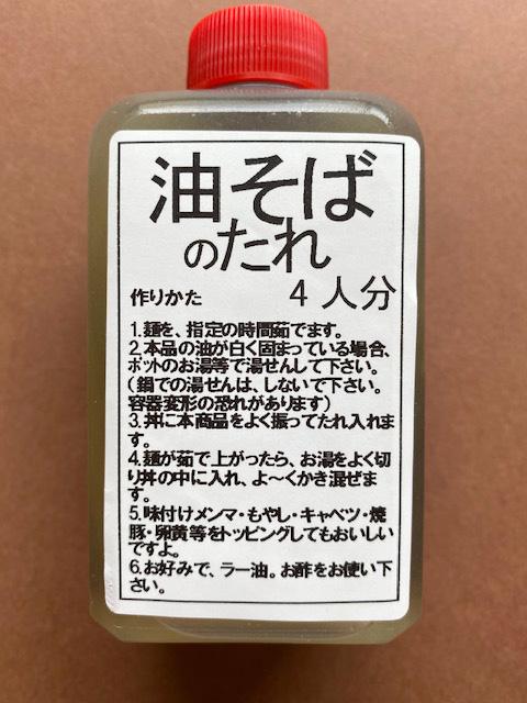 【油そばスープ】※ご希望の方には、製麺星川の生麺(ラーメンはじめ、麦切り、うどん等にも)に相性抜群で好評を得ている「油そばスープ」を、オプション(バラ売り)にてご購入いただけます。税込価格 400円 [送料別]1234567891011121314151617181920袋 ■商品名□: 油そばスープ■商品番号: sup11■内容量□: 170ml ■原材料□: しょうゆ(国内製造)、植物油脂、動物油脂、肉エキス、食塩、発酵調味料、砂糖、香辛料、酵母エキス、玉ねぎ、メンマパウダー、酒精/調味料(アミノ酸等)、カラメル色素、酸味料、香辛料抽出物、増粘剤(グァー)、(一部に乳成分、小麦・牛肉・大豆・鶏肉・豚肉を含む)■梱包形態: 簡易包装■配送方法: 通常便■配送料□ : お買い物案内(送料について)