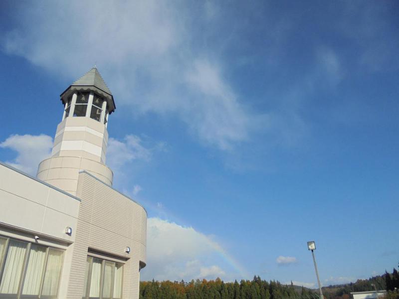 青空に虹がかかりました。 山々の紅葉もキレイです。 いい一日になりそうですね。