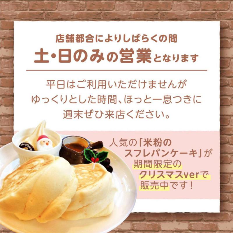 またまた久しぶりの更新になってしまいました。 既にインスタやフェイスブックで告知しておりますが、 当面の間、平日の通常営業はお休みさせていただきます。 理由は母親が入院してしまった事や、父親の調子もあまり芳しくないこと もっともまだ介護が必要なほどではないのですが、 サポートは必要なので、以前ほど時間に余裕がなくなってしまった事です。 例年1月〜2月は灯油配達の繁忙期や除雪などで平日はお休みしてましたが、 来年はそれ以降も平日営業は難しくなるかもしれません。 ご迷惑をおかけして申し訳ございません。 状況はこのHPでお伝えしていきますので、よろしくお願いします。 なお、週末は営業しますので、お気軽にお立ち寄りください。 テイクアウトや夜の部の予約は受け付け中です。 現在パンケーキクリスマスバージョン販売中です! 今年の営業は26日までです。 よろしくお願いいたします。 ※画像はあづまーるさんに作っていただきました。