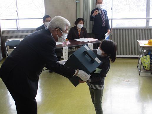 一昨日、新入生全員に町長さんから、ランドセルの贈呈をしていただきました。コロナ感染が心配だということで、代表の新入生にだけの手渡しとなりましたが・・・ 会が始まる前のこの様子を見て、私のほうが立派な箱入りのランドセルに圧倒されてしまいました。本当にありがたいことです。 みんなとても立派な態度でした。えらいえらい! ランドセル贈呈の後、「おおきくなるっていうことは」の絵本をもとに、新入生に話をしました。「もう、大人の歯が生えた人?」「は〜い」…「前より泣かなくなった人?」「は〜い」「自分より小さい人や、お友達にやさしくできるひと?」「は〜い」 時折、「ぼくできるかな〜?」と、おうちの方に聞く姿もありましたが、今よりもずっと大人になって入学してくれることと思います。 廊下では、5年生が新1年市のお世話をするために、待機していました。以下、新最上級生が、どんなお兄さんお姉さんぶりをしたか、見てください。 校歌は、しっかり教えてくださいよ! かくして、役目をしっかり果たした5年生。顔つきも、だんだん最上級生の顔になってきています。