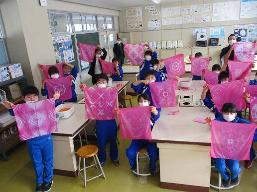 今日は、小松織物工房から、小松寛幸様と知見様にご来校いただき、ベニバナ染めをご指導していただきました。 まずは、模様を考えながらハンカチを折ったり、割りばしと輪ゴムで縛ったりします。 「こうすると、こんなふうにしあがるよ。」「おーっ!」「こんなやり方もあるね。」 さっそくトライ!ALTのグラディスさんとリッキーさんも一緒です。「できたぞ!」「先生、教えてください。」「いいよ。」 今回、紅もちを提供して下さった高木繁様もいらっしゃいました。1Kg40,000円する紅もちを、400gも下さいました。(なんと、16,000円相当です!とても贅沢なことです。おかげさまで、子どもたちの作品は、普段よりもずっと色濃く出来上がりました。本当にありがとうございます!) さっそく、水で練習です。水を含ませる意味もあります。 最初は、原液でちょっと染めてみます。黄色に染まりました。「魔法の液をいれます!」「色が、変わった!」 班長、かき混ぜて! いち、にのさん!で、みんな同時に液に入れます。そうしないと、早く入れた人と遅く入れた人の作品の色が違ってしまうのだそうです。 よくもんで、液をしみこませて…。冷たいけれど、がまんがまん・・・ できたね、リッキー!ラッキー(^^)/!あら、かわいい!おー、ダイナミック!いいねえ! グラディスも、できた! み〜んな、できた! ベニバナは、様々なところで作られていますが、色を染めるのは日本だけ。しかも、その多くのものが白鷹産だとか。小松さんは、「日本の紅をつくる町」はもちろん、「世界の紅をつくる町」なんだよと教えてくださいました。 そして、みんなの作品は「世界に一つ」。額に入れて、うちで飾ってくださいとおっしゃっていました。白鷹町の伝統を、とても贅沢な形で味わったひとときになりました。関わってくださった皆様に、心より感謝申し上げます。