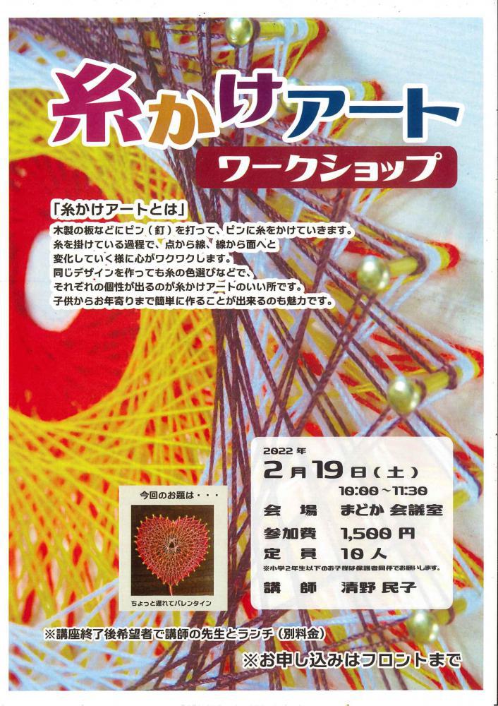 糸かけアートワークショップ2月19日(土)10:00〜11:30会場:まどか会議室参加費:1,500円定員:10名※小学生のお子様は保護者同伴でお願い致します。★今回のお題は・・・ちょっと送れてバレンタイン※講師:清野 民子講座終了後、希望者で講師の先生とランチ(別料金)※お申込みはまどかフロントまで0238-42-4126※老若男女、またお子様でも簡単に作れます。是非、ご参加お待ちいたしております♪