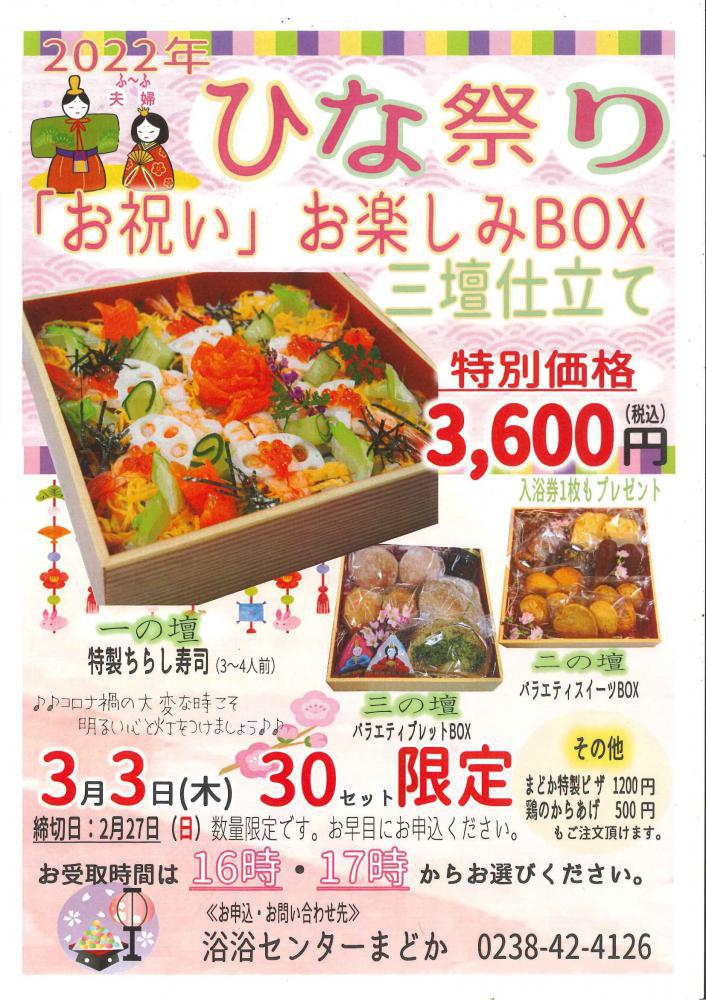 2022年3月3日(木) 30セット限定 ひな祭り「お祝い」お楽しみBOX三壇仕立て 特別価格・・・3,600円税込☆一の壇・・・特製ちらし寿司(3〜4人前)☆二の壇・・・バラエティスイーツBOX☆三の壇・・・バラエティブレットBOXお受取り時間・・・16時or17時 他、●まどか特製ピザ・・・1200円税込 ●まどか特製鶏の唐揚げ・・・500円税込もご注文いただけます♪※入浴券1枚プレゼント♪お申し込み締め切り2月27日(日) 数量限定※ブレット・スイーツ全部手作りです。まどかの味お楽しみ下さい!!※コロナ禍で大変な時こそ、明るい心と灯をつけましょう♪お申込み・お問い合わせは TEL0238-42-4126まで!