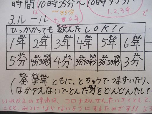 3月3日の中間休み、延期していたなわとび大会が行われました。決められた時間内に、トータルで何回跳べるか競い合いました。その様子をご覧ください。 密を避けるために、上級生の部、下級生の部に分けて行いました。次は下級生の番です。 もうみんな必死です。ふと気づくと教職員も戦っていました! 勝負を制したのは・・・・ ジャーン!なんと2年生!6年生からは、「5年生と跳ぶ時間が20秒も違う〜、それは大きい〜!」と声が出ていましたが…。 体育委員会が決めたルールの中での勝負事。一番は、みんなが心を寄せ合って、ドキドキしながらも一生懸命跳んだことが尊い!ということで締めくくりましょう。一人ひとり、縄に飛び込むという怖さの壁を乗り越えたり、タイミングを計るために友達の背中を押したり、何とも言えない成長がうれしい大会でした。