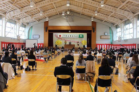 18日(金)、本校第75回卒業証書授与式が挙行されました。今年度も新型コロナウイルス感染拡大防止のため、その対策を万全に整え、縮小した形で行われました。卒業生、入場!!どの子も緊張しながらも、堂々と入場。卒業生の頭の中にはいろいろな思い出が巡っていたことでしょう。主役の卒業生、かっこいい!!保護者の皆様の撮影がすごい!俳優、女優を撮影するようなカメラの数・・・最高のワンショットをお願いします!練習通り、しっかりと入場できました。お子様の晴れ姿、いかがですか?そして最後の卒業生が入ってくると、拍手も最高潮に!!大きくそしてたくましく成長したこの後ろ姿、とってもすてきですね。メイン・イベント!「卒業証書授与」一人一人に手渡しました。六年間の頑張りが詰まった卒業証書は、とても重く感じました。在校生も6年生のその姿をしっかりと目に焼き付けていました。今年度もご来賓のみなさまをご招待することはかないませんでしたが、町長様よりいただいたお祝いのメッセージを代読させていただきました。さあ、いよいよ、在校生と卒業生の最後の授業のクライマックスです!!卒業生もスタンバイOK!!6年生との楽しかった思い出や感謝の気持ちを、呼びかけの言葉と歌でプレゼントしました。6年生に届いたかなあ・・・コロナ禍にあり、なかなか練習できませんでしたが、気持ちを込めて精一杯伝えようとした在校生の歌。とってもすてきでした。そして今度は卒業生からの言葉です。入学してから卒業するまでの出来事やその時々の思いを一人一人かみしめながら発表していました。ジーンときました・・・そして卒業生から、これからの決意を込めた最後の合唱をプレゼントしてもらいました。感動しました・・・お別れが近づいてきました・・・校歌黙唱です。卒業生が歌った歌を聞きながら、しっかりと心に刻みました・・・卒業生退場です・・・入場時は緊張感が見えましたが、退場時には、満足感や成就感があふれていたように感じました。左手には、しっかりと卒業証書を持ち、まっすぐ前を見て、堂々とした態度で、りっぱに退場していました。感極まって目頭を押さえる卒業生も・・・これもとってもすてきな姿ですよね。未来に向かって大きく羽ばたいてください!困ったときにはいつでも帰ってきてね!22名の若杉達よ!「がってしね」気持ちを持ち続けて、常に前を向いてがんばれ!!!在校生も最後までよく頑張りました。卒業生の保護者の皆様、本当におめでとうございました!わたしたち東根小学校教職員は、いつまでも22名の子供達のことを応援しています!!