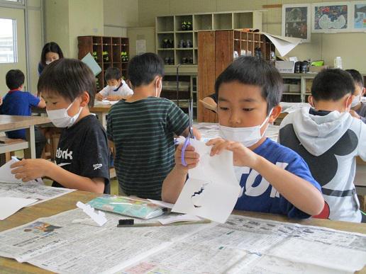 図工室に行くと、何やらチョキチョキ。 スパッタリングをする時間のようです。 描いて 考えて 切って スパッタリング! わくわく どんな作品がができるかな…ドキドキ! 45分は、すぐに経ってしまいました。まさに、生みの「楽しみ」ですなぁ。