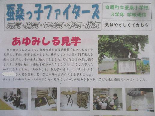蚕を迎えて一週間。最初のころは寒くて、蚕たちを暖の取れる部屋に置いておきましたが、今は蚕部屋に移り、元気に桑を食べています。「なつかしい〜!」去年の3年生がやってきました。「こうして網をかけると、蚕がのぼってくんのよ。」「へえ〜。」「そこに、桑をかける。」「はい。」 子どもたちは3時に帰るので、朝だけ給桑します。毎朝、蚕の成長を感じながらの給桑です。 蚕の先生方も、真剣です。 蚕が大きくなってきたので、やっと手にのせてよいとお許しが出ました! 給桑の後の掃除までが、朝の仕事です。 すみずみまで、ごくろうさまでした!3年生は、土日も朝8時と午後3時半に当番で蚕に桑をかけます。土日にも来て下さる蚕の先生方にも、心より感謝いたします。