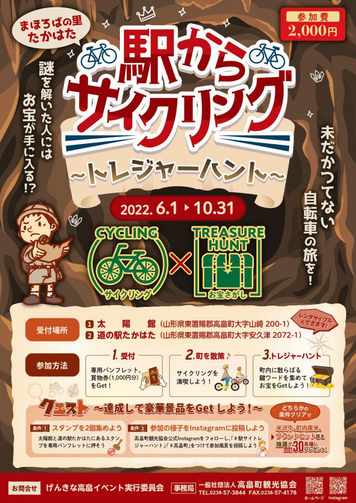 未だかつてない自転車の旅を!「サイクリング×お宝さがし」の新感覚サイクリングイベントを開催します!高畠町太陽館(JR高畠駅)もしくは道の駅たかはたから出発して、サイクリングをしながら謎を解いてお宝をゲットしよう♪さらに、追加クエストとして@太陽館と道の駅たかはたにあるスタンプを専用パンフレットに押す。 ※参加者にのみ専用パンフレットを配布いたします。A参加の様子をInstagrammに投稿する。の、どちらかの条件をクリアすると、抽選で30名様に米沢牛や高畠ブランドセット等をプレゼント♪♪・期 間:6月1日〜11月30日まで ※期間延長・参加費:お一人様2,000円・両受付場所ではレンタサイクルもございますのでぜひご利用ください。 (料金別途)
