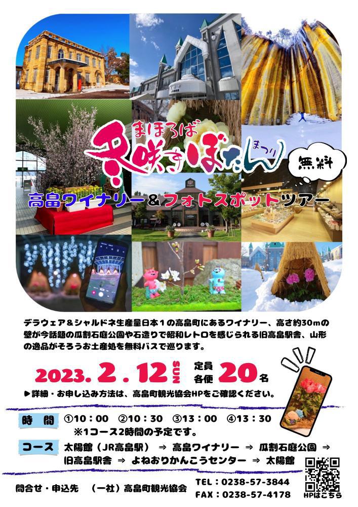 ↑詳細はこちらから第22回まほろば冬咲きぼたんまつりにおいて、町内観光名所を巡る周遊バスを運行いたします!「高畠ワイナリー&フォトスポットツアー」高畠町内で今話題になっている「映えスポット」と山形の逸品がそろうお土産どころをめぐります。ワイン片手に巡ってみませんか?・日時…2月12日(日) 各便所要時間2時間 ・10時 出発 ・10時30分 出発 ・13時 出発 ・13時30分 出発・料金…無料・定員各便20名(予約優先)・行程(天候により変更となる場合がございます。) 太陽館→高畠ワイナリー→瓜割石庭公園→旧高畠駅舎→よねおりかんこうセンター→太陽館・添乗…役場商工観光課または観光協会職員〇お申し込み先 高畠町観光協会 ・TEL:0238-57-3844 ・Mail:mahoroba@takahata.info(下記お問合せフォームでもお申込みいただけます。) 件名に「周遊バス申し込み」と記載し、本文にご希望のコース、人数、代表者の氏名、住所、電話番号をご記載ください。※先着順となっております。ご希望の方はお早めにお申し込みください。