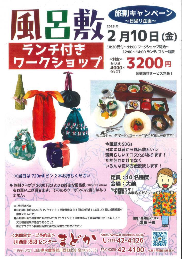 2023.2月10日(金)風呂敷ワークショップ(ランチ付き)〜旅割キャンペーン・日帰り企画〜●時間:10:30〜受付 11:00〜ワークショップ開始〜 12:00〜14:00 ランチ、フリー解散●定員:10名程度●会場:大輪●料金:お一人様4000円の所→3200円(旅割キャンペ-ンで20%OFF)※他旅割地域限定電子クーポン2000円より、お好きな風呂敷(100cm×70cm)をお買い上げできます。そのため、クーポンのお渡しはありません。《ご利用条件》 ワクチン接種証明(県内2回以上)・県外3回以上の接種証明と身分書を持参下さい!!※予約制です。ご予約はTEL0238-42-4126までお申し込みください。