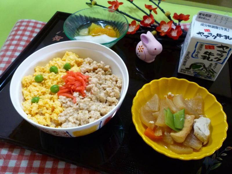 栄養課です。少しずつ春が近づいて来ました。入所者の皆様に幸せで元気な気持ちになる様に、そぼろ丼を提供しました。幸せホルモンが放出されることがあるという、炒り卵の黄色をメインに、元気が出る赤やリラックス効果の緑、鶏そぼろはあんで固めて、食べやすくしました。丼物はとても好まれる一品です。もちろん皆さん完食されておりました。