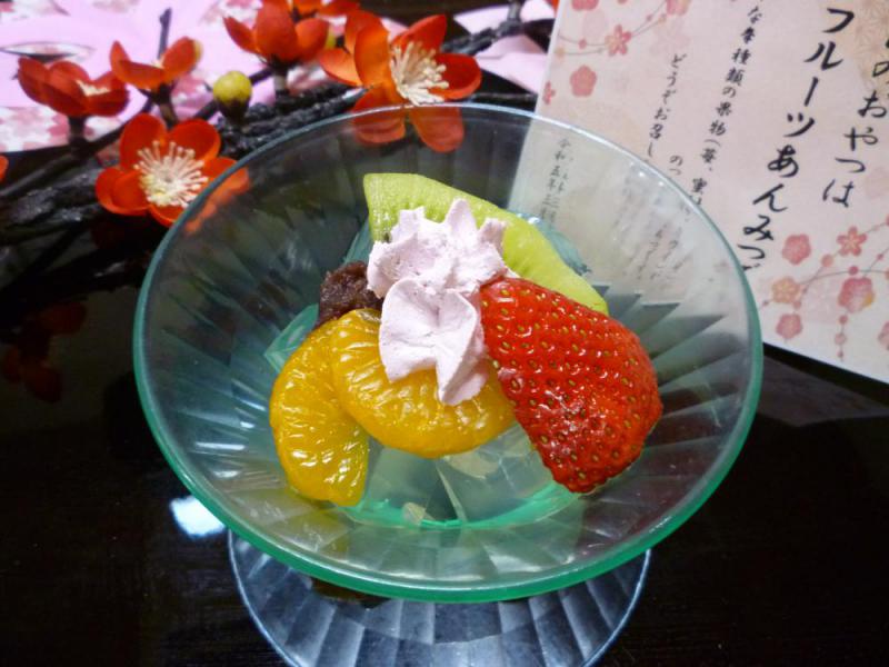 栄養課です。3月のお菓子の日は「フルーツあんみつ」をお出ししました。白鷹産いちごと桜色の生クリームをトッピングして、みかん、キウイフルーツあんこなどを色鮮やかに盛り付けしました。寒天は、天草とオゴノリといった海藻から作られています。低カロリーでアガロペクチンという食物繊維がたっぷり入っていて、腸内環境改善効果や血圧を下げる作用があります。しかし、食べ過ぎると便秘になったり悪影響が及ぼすので、ほどほどに取り入れていきたいですね