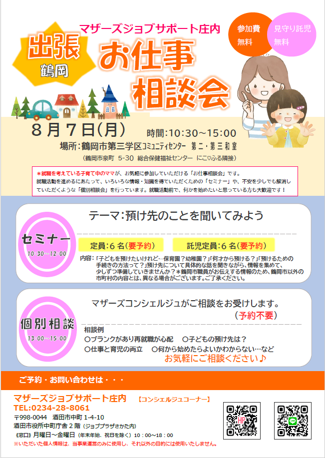 ●8月マザーズおしごと相談会in鶴岡開催のお知らせ