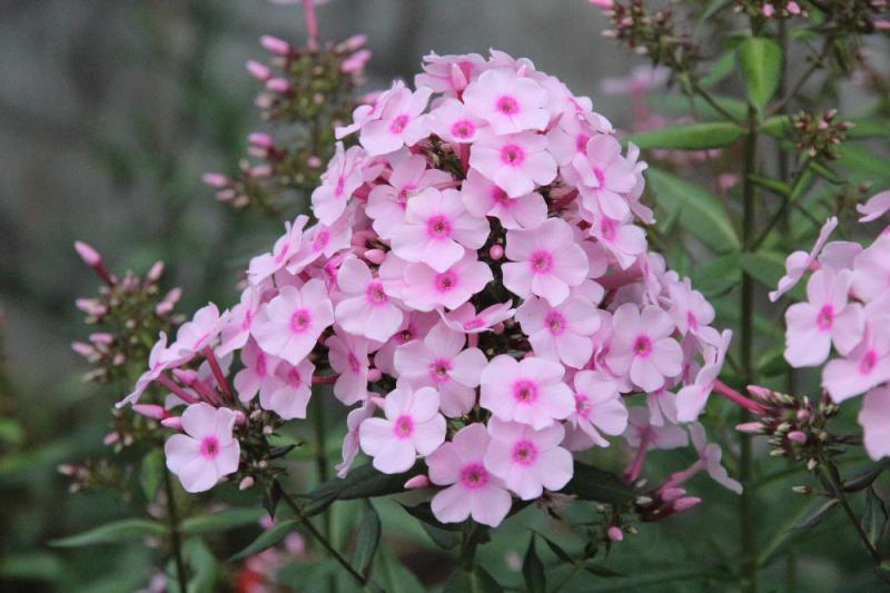 ●まっすぐに伸びた茎の先にてまり型やピラミッドのようにたくさんの花を咲かせている「オイランソウ」がそちこちの家の庭に咲いています 花はシバザクラのような形でピンクや赤や白い花色です 花魁(おいらん)が使っていた化粧用の白粉に似ているとして「オイランソウ」と呼ばれていたそうで においを嗅いでみるとかすかにおしろいのような香りがしました 今は英語名の一部を用いてフロックスと呼ばれるそうです