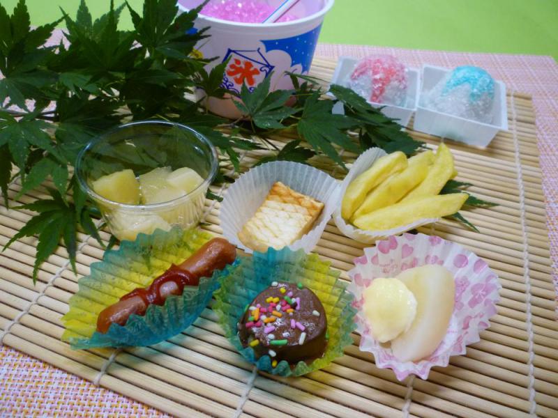 栄養課です。夏の大イベント、「夏祭り」が開催されました。昼食は焼きそばや焼き鳥とお祭りメニューを提供しました。おやつはお祭りを存分楽しんで頂こうと、初めてのおやつバイキング!わたあめ、かき氷、チョコバナナ、いか焼き、フランクフルト、じゃがバター果物ゼリー、フライドポテトからお好きなものを3つ選んで頂きました。入所者の皆様がわたあめをほうばったり、冷たいかき氷を食べて楽しいんでいる笑顔を見ていると、疲れが飛んでいったような気になりました。