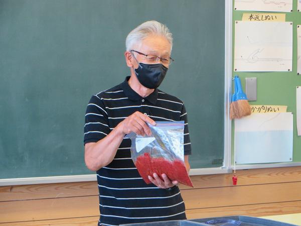 8月25日(金)、春からお世話になっている畑の先生(新野先生)をお招きし、4年生が夏休み前に収穫した紅花を使って紅餅づくりを行いました。まずは、すり鉢を使って紅花をつぶす作業です。すり鉢をおさえてあげたり、時々交代したりしながら、友達と協力してすり潰します。お手本として見せていただいた先生の素早い手さばきに、思わず「おおー!」「プロの技だ!」といった声が漏れだします。 次に、すりつぶした花を固く絞って水分をとります。 最後に、適当な大きさに丸めて、平たく伸ばしていきます。この後、しばらく乾燥させて出来上がりです。毎日、ひっくり返す作業も必要とのことでした。4年生の皆さん、忘れずにね!