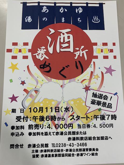 4年ぶりに「ゆのまち酒番所めぐり」を開催します。10月11日(水)午後6時から受付、午後7時スタートチケットは9月15日(金)から販売します。