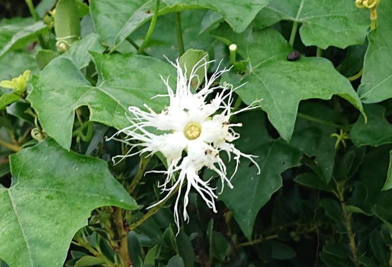 ●こんなに真っ白の花が「カラスウリ」と呼ばれるのは この実をカラスが好んで食べる あるいは熟した紅い実がカラスが食べ残したように見えることから命名されたなど諸説あるようです 真っ白なひげが伸びたような「カラスウリ」の花は葉の付け根の花びらの先がレース状白い花を夕方に咲かせ日の出前にはしぼむそうです カラスウリの花の筒が非常に長く 夜行性で口が長いスズメガでないと花の奥の蜜には到達できないことから夜行性のガを引き寄せるためと考えられるそうです