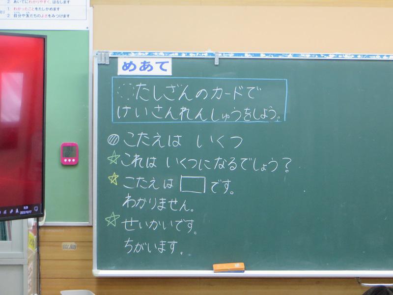 10月17日(火)、朝晩はめっきり寒くなってきました。毎日の健康観察では、今週に入ってから「鼻水」「鼻づまり」「咽頭通」「咳」を訴える児童が急に多くなりました。一日の気温が大きく変化しています。体調管理には十分気を付けたいものです。さて、涼しい秋は勉強をするのにも最適な季節です。こちらは1年生。「たしざんカード」を使って、お互いに問題の出し合いっこです。これまで学習してきた繰り上がりの計算方法を思い出しながら暗算で答えます。答えが当たった時の嬉しそうな笑顔がかわいい1年生でした! こちらは4年生。「1枚60円のカード5枚と1枚40円のシール5枚買った代金の合計は?」まずは、2種類の式を見てそれぞれの解き方について考えます。ただ、答えを導き出すだけでなく、式が意味することを理解することも大切です。図を使いながら分かりやすく説明していました。外は肌寒いですが、脳みそをフル回転させた頭はあたたかくなったようです。