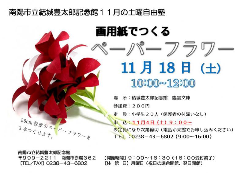 土曜自由塾は、6月〜12月の第4土曜日(変更あり)に行う小学生を対象とした講座です。つくるものは決まっていますが、その中で自分の好きなようにのびのびと楽しくつくります。11月の土曜自由塾は、画用紙でつくるペーパーフラワーです。申 込:11月4日(土)9:00〜※定員(小学生20人)になり次第締切電話か来館でお申し込みください。TEL:0238−43−6802(9:00〜16:00) 10月21日(土)に行った「ハロウィン帽子をつくろう」無事に終了しました。ありがとうございます。土台の帽子作りを終えた後は、みんな自由に自分だけの飾りつけを楽しみ、あっという間に時間が過ぎました。自分のセンスが光った帽子になったのではないでしょうか。被ったり飾ったりしてくださいね。