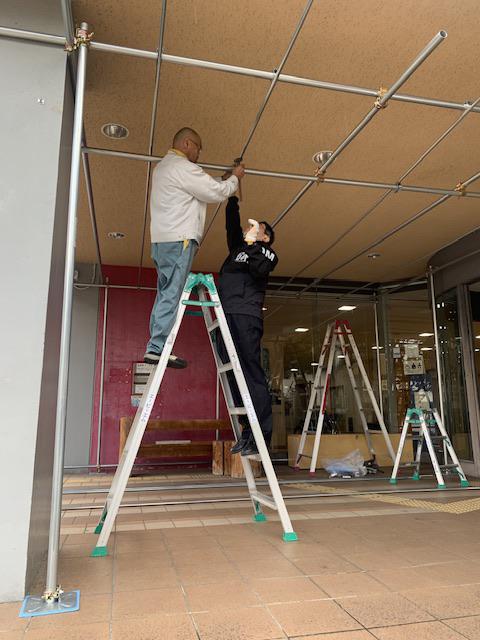 昨年から設置した正面玄関前のイルミネーション。流れ落ちるようなライト(ドロップライト)が昨年好評でした。今日はその準備をしています。