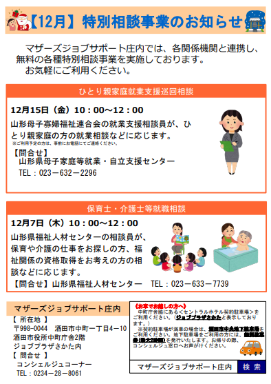 マザーズジョブサポート庄内では、各関係機関と連携し、各種特別相談事業を実施しております。ぜひ、ご利用ください。  保育士・介護士等就職相談 ※お申し込み不要日 時  12月7日(木)10:00〜12:00場 所  マザーズジョブサポート庄内 セミナールーム問合せ  山形県福祉人材センター      пF023-633-7739HP:http://www.ymgt-shakyo.or.jp/jinzai/保育士・介護士・看護師など資格をお持ちの方や、資格取得を目指している方、福祉職にご関心のある方は、お気軽にお越しください。  ひとり親家庭就業支援相談 [要予約]日 時 12月15日(金)10:00〜12:00場 所 マザーズジョブサポート庄内 セミナールーム問合せ 山形県母子家庭等就業・自立支援センター     пF023-632-2296HP:http://www.y-boshi.com/self-support/ひとり親家庭の方や今後について考えている方、どうぞお気軽にご相談ください。 ※各相談会について、利用ご希望の方は、マザーズジョブサポート庄内までお気軽にお声掛けください。※ご相談の際、お子さまの託児は『保育ルーム きらきら』をご利用いただけます。託児ルームのご利用には、事前のご登録が必要です。 【駐車場について】お車でお越しの際は、中町庁舎脇にあるセントラルホテル契約駐車場をご利用ください。(ジョブプラザさかたと表示してあります。)※契約駐車場が満車の場合は、酒田市中央地下駐車場をご利用ください。無料駐車券(最大2時間)を発行いたします。お帰りの際に、コンシェルジュ窓口へお声がけください。 ◇お申込み・お問い合わせ◇マザーズジョブサポート庄内TEL:0234-28-8061メールでのお申込みはコチラ
