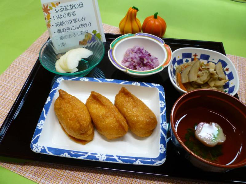 栄養課です。しらたかの日と言いまして地産地商の活動の一環として白鷹町の旬食材をふんだんに使用する日で、岡の台ごぼうや黄菊などを使用しました。メインのいなり寿司は大人気メニューで皆さん残さずに食べられました。