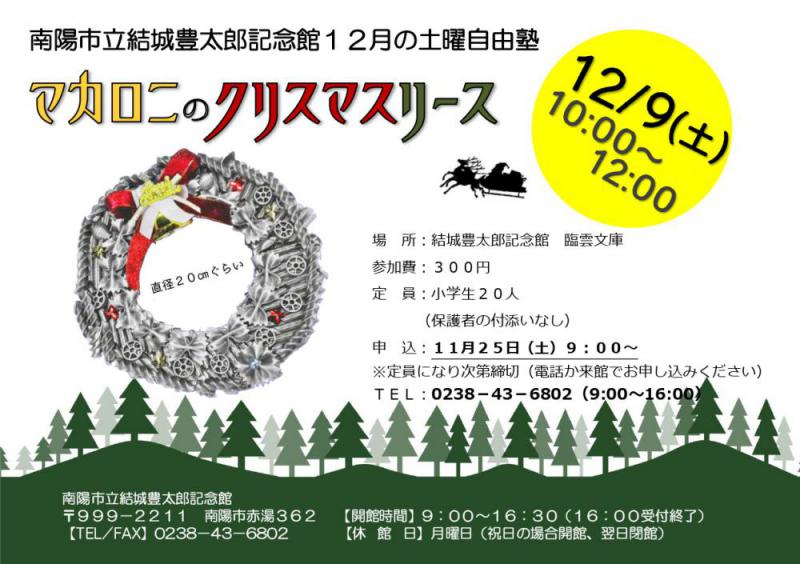 土曜自由塾は、6月〜12月の第4土曜日(変更あり)に行う小学生を対象とした講座です。つくるものは決まっていますが、その中で自分の好きなようにのびのびと楽しくつくります。12月の土曜自由塾は、マカロニのクリスマスリースです。申 込:11月25日(土)9:00〜※定員(小学生20人)になり次第締切電話か来館でお申し込みください。TEL:0238−43−6802(9:00〜16:00) 11月18日(土)に行った「画用紙でつくるペーパーフラワー」無事に終了しました。ありがとうござます。自分の好きな色で作った枯れない花、どうぞ飾って楽しんでくださいね。
