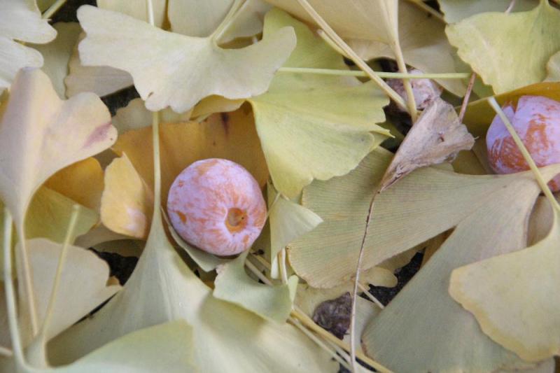 ●烏帽子山八幡宮の東端にある東正寺本堂入口のそばに南陽市の名誉市民結城豊太郎翁の墓地があります 墓地の一角に大きな「イチョウ」の木があり晩秋には鮮やかな黄色が訪れる人の目を楽しませてくれます 黄色の葉とともにイチョウの実がたくさん落ちており踏みつけると強烈なニオイがするので嫌う人もいますが この実を乾かし殻の中の実を撮りだしたものが「ギンナン」で茶碗蒸しや炊き込みご飯などの美味しい食材です