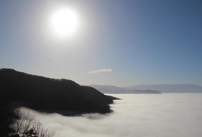 ●雲海が漂っている空に太陽が輝いて雲海を一層白く見せてくれます 今日も9日雲海その4です 今日まで4日間の雲海が十分一山から見える全てです これからの天気予報を見るともう雲海はみることができないのでは 見納めの雲海です