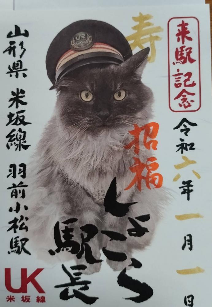 新年早々の能登大地震には驚かされました。被災されました皆々様に心からお見舞い申し上げます。避難生活を送りの皆様に心から労いの言葉を申し上げますと共に、いち早い復旧が実現しますようお祈り申しげます。 一方、穏やかな新春を迎えた川西町は、本日2日も快晴に恵まれています。「おめでとうにゃ」とごあいさつを申し上げながら、本年も駅長しょこらはもとより、羽前小松駅や米坂線、さらにはNPO法人えき・まちネットこまつもご愛顧をくださいますようお願いいたします。