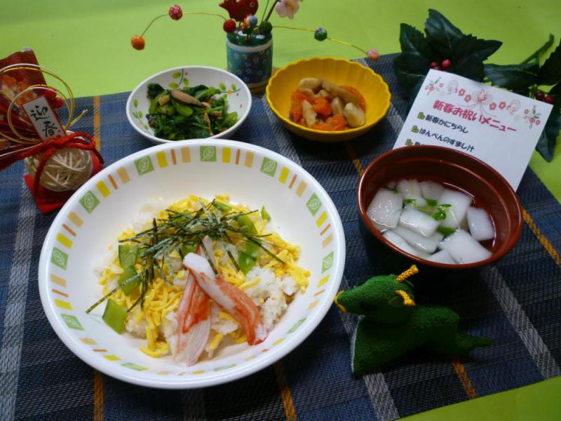栄養課です。輝かし新年を迎え、謹んでお慶び申しあげます。本年も美味しい食事提供と、一人ひとりに合った食事対応を目標に栄養課一同、誠心誠意努める所存でございます。どうか本年もよろしくお願い致します。本日は、新春かにちらしと里芋の煮物、小松菜の和え物、はんぺんのすまし汁を提供いたしました。メインの「かに」は大変喜ばれておりました。