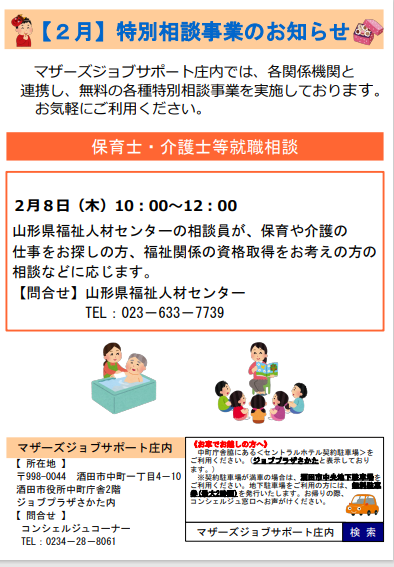 マザーズジョブサポート庄内では、各関係機関と連携し、各種特別相談事業を実施しております。ぜひ、ご利用ください。 保育士・介護士等就職相談 ※お申し込み不要日 時 2月8日(木)10:00〜12:00場 所 マザーズジョブサポート庄内 セミナールーム問合せ 山形県福祉人材センター пF023-633-7739HP:http://www.ymgt-shakyo.or.jp/jinzai/保育士・介護士・看護師など資格をお持ちの方や、資格取得を目指している方、福祉職にご関心のある方は、お気軽にお越しください。 ※各相談会について、利用ご希望の方は、マザーズジョブサポート庄内までお気軽にお声掛けください。※ご相談の際、お子さまの託児は『保育ルーム きらきら』をご利用いただけます。託児ルームのご利用には、事前のご登録が必要です。 【駐車場について】お車でお越しの際は、中町庁舎脇にあるセントラルホテル契約駐車場をご利用ください。(ジョブプラザさかたと表示してあります。)※契約駐車場が満車の場合は、酒田市中央地下駐車場をご利用ください。無料駐車券(最大2時間)を発行いたします。お帰りの際に、コンシェルジュ窓口へお声がけください。 ◇お申込み・お問い合わせ◇マザーズジョブサポート庄内TEL:0234-28-8061メールでのお申込みはコチラ