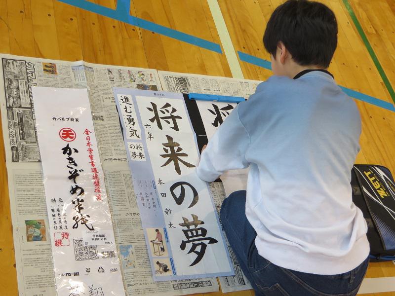 1月10日(水)、今日は校内書き初め会を実施しました。まずは全員体育館に集合し、はじめの会を行いました。ジェットヒーターとストーブで温められた体育館でしたが、少しひんやりした空気と程よい緊張感が子供たちの集中力を高めます。 その後、1・2年生は教室で、3〜6年生はそのまま体育館で書き初めを行いました。どの子も真剣な眼差しで、一画一画心を込めて書いていました。昔から「書は心画なり」といいますが、子供たちの前向きな思いが伝わってくる字ばかりでした。作品は来週15日(月)〜2月2日(金)の参観日まで各教室前に展示する予定です。来校された際には、子供たちの力作をぜひご覧ください。