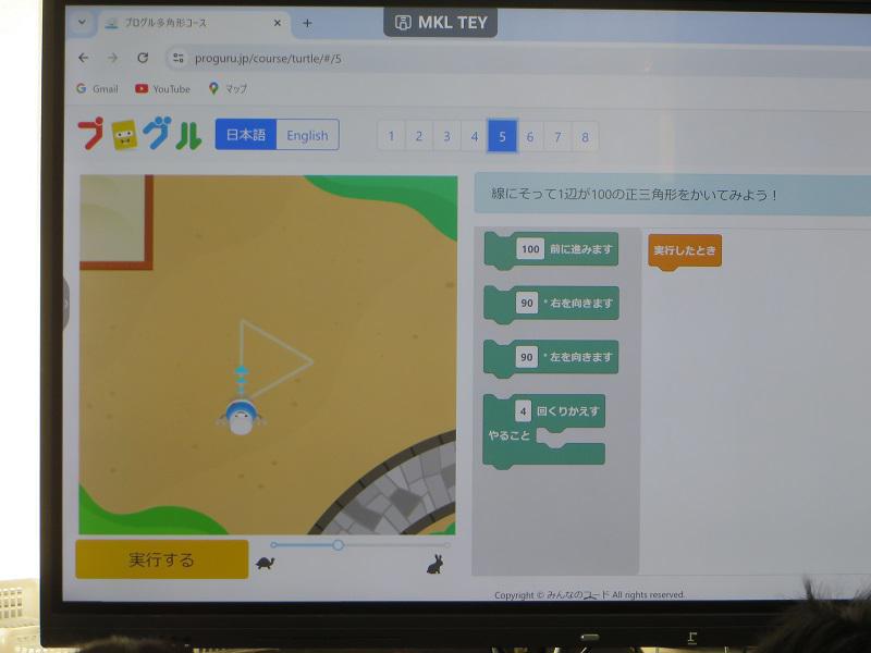 1月11日(木)、今朝は上空の寒気や放射冷却などの影響で冷え込みましたが、日中は冬晴れの穏やかな天気となりました。子供たちは、冬休みモード→学校モード に気持ちを切り替え、元気に過ごしています。各家庭での「生活リズムチャレンジ週間」への取組にも感謝いたします。さて、今日は5年生のクラスで行われていたプログラミング学習の様子を紹介します。内容は、キャラクターを動かして、様々な正多角形を作図する学習です。教室を覗いたときは、ちょうど正三角形に挑戦していました。指定した歩数で前に動かした後、どのくらいの角度で方向転換させるか・・・「正三角形だから60°?」「あれ?角度がおかしい・・・」いろいろ試行錯誤する中で、「120°」にはたどり着いたものの、なぜ120°なのかを説明することが難しかったようです。一体どこの角度を指しているのか…ICT支援員の先生からのヒントをもとに、みんなで120°探しが始まりました。 これまで算数で学んできた知識を生かしながら、みんなで一生懸命考え、ようやく答えにたどり着いたようです。コツをつかめば、手書きでは難しいような正多角形もプログラミングで作図できそうですね。正三角形、正四角形(正方形)、正五角形、正六角形・・・と、どんどん辺の数を増やしていくと、どんな形に近づいていくでしょうか…?
