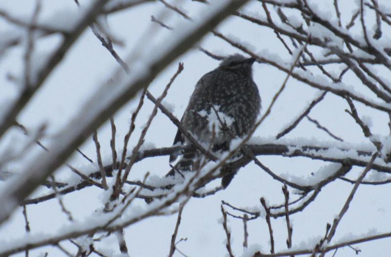 ●チラチラと雪が降る中 灰色の鳥が枝にとまっています ネットで調べてみると「ヒヨドリ」ではないかと思われますが鳥に詳しい方教えてください ムクドリではないかと調べてみるとくちばしや足が黄色でないのでムクドリではないと思われます