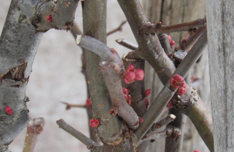 ●咲いている花がありませんので花芽を追いかけています 「ボケ」ですが桜と似て紅く覆われています どのつぼみも固く閉じていますが蕾の中でいつ花を咲かせようかとうごめているでしょうか まだまだ遠い先のことですが