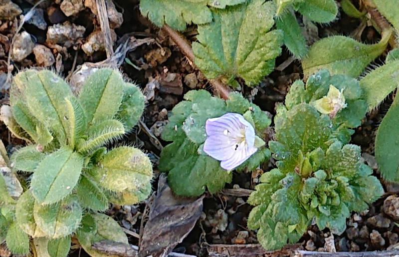 ●秋に芽を出して他の植物が繁茂しない冬に横に広がって育ち 早春に薄紫色の花をつける「オオイヌノフグリ」が雪の消えた畑で花をつけていました 今年は雪もなく例年になく早く花を咲かせています 寒さに耐えるため細胞内の糖濃度を高める機能を持ち 葉と茎に生える短い毛で雪と霜を遠ざけて保温するのだそうです 別名「星の瞳」とも呼ばれていて「オオイヌノフグリ」とは大違いです