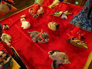 今年も九里裁縫女学校の女学生が使用していた型紙から復元していただいた蝉袋と『裁縫おさいくもの』を参考に制作していただいたちりめん細工を展示しております。